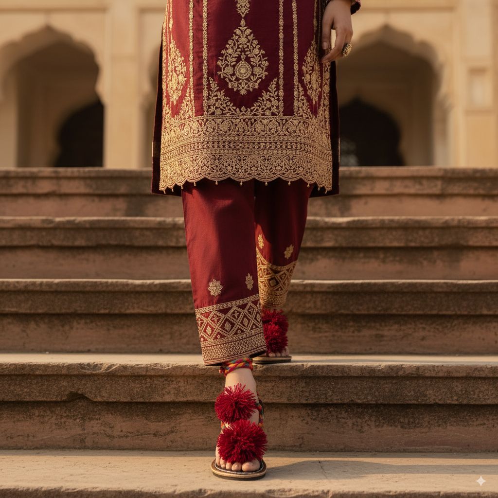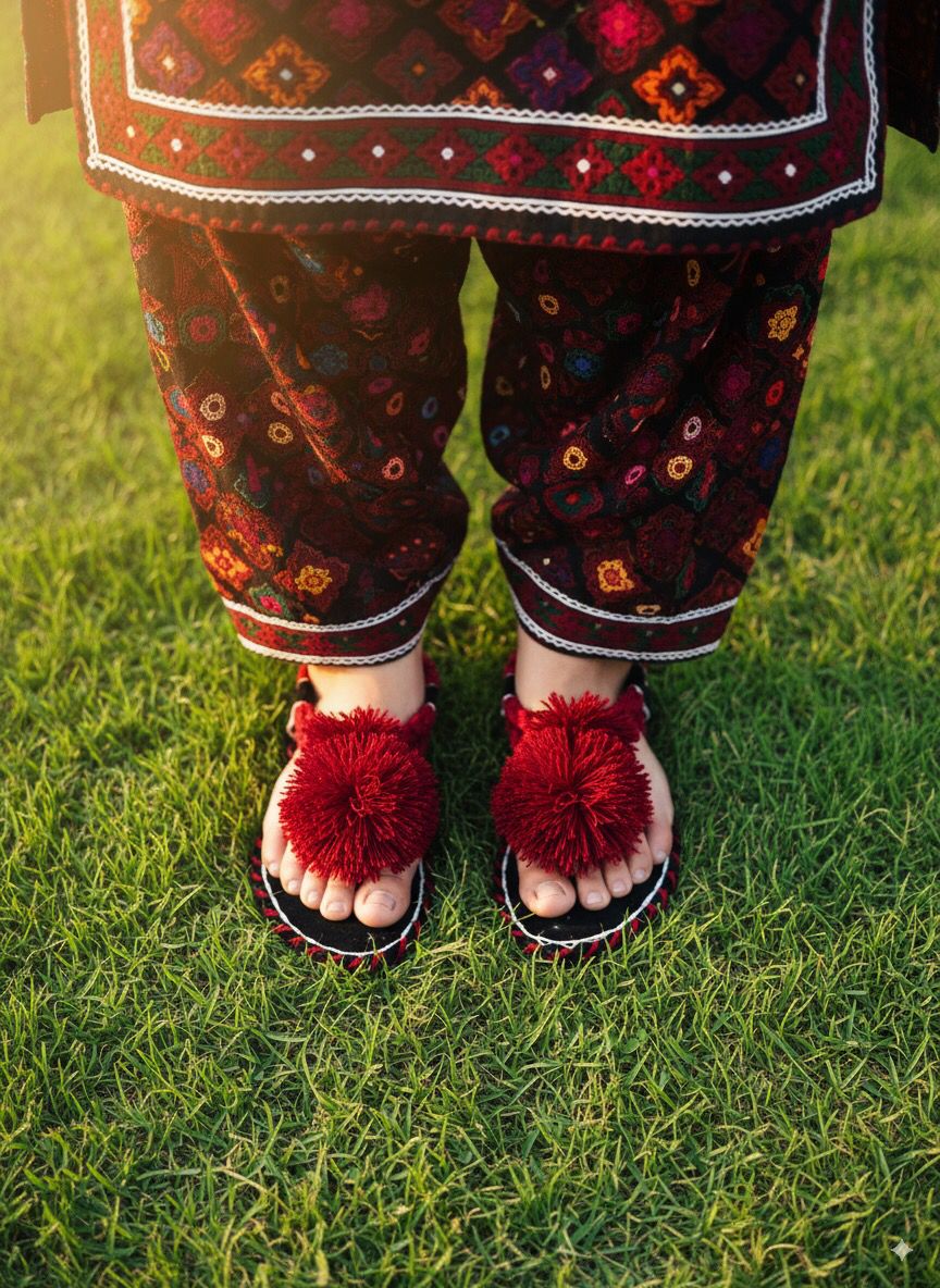 Bring tradition and style together with these beautifully handcrafted Balochi Shoes. Made with premium materials and decorated with vibrant handmade pom-poms and colorful woven straps, these sandals are a symbol of heritage and elegance. Perfect for festive occasions, cultural gatherings, or casual wear, they add a unique touch of tradition to every outfit. Lightweight, durable, and comfortable — these shoes celebrate the rich craftsmanship of Balochistan while keeping your style modern and chic.